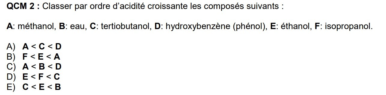 grrr Posted January 22, 2022 Author Posted January 22, 2022 il y a 3 minutes, captainsdaughter a dit : A : CH3-OH B : H2O C : D : E : CH3-CH2-OH F : Ce qui fait comme classement C<F<E<A<B<D si je ne me trompe pas merciii !! Quote