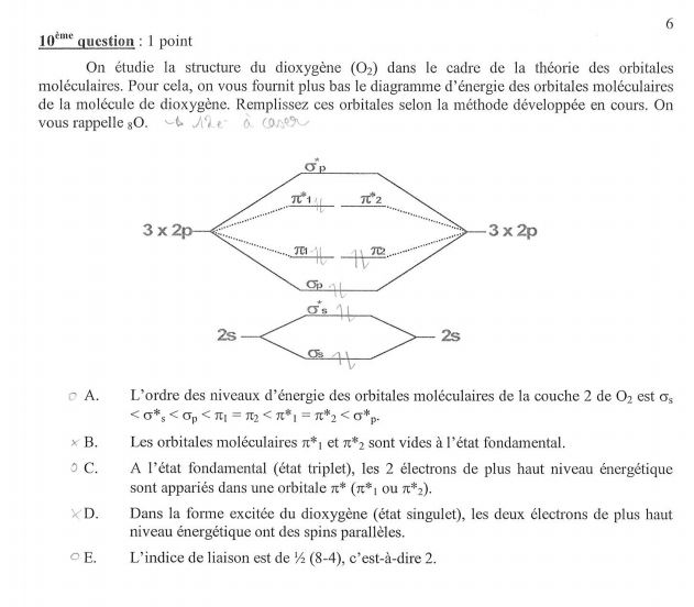 Solution bento-lucas Posted November 11, 2015 Solution Posted November 11, 2015 Bonjour, Pour l'item C de ce QCM, tu dois te poser le diagramme d'énergie de ton Oxygène à l'état fondamental (triplet donc, comme te le rappelle l'item) : Du coup, les deux électrons célibataires, qui sont le plus en haut sur le diagramme, sont ceux avec le plus haut niveau énergétique, par conséquent, l'item est vrai, ils sont bien sur une orbitale de type pi* J'espère t'avoir éclairé
