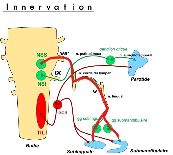 Ancien Responsable Matière Solution Zeepek Posted January 27, 2022 Ancien Responsable Matière Solution Posted January 27, 2022 Salut ! @Caillourocheux Alors oui ça se fait par le nerf VII, mais seulement en partie on va dire. Ce passage du cours est un peu complexe : "Au niveau de l’innervation, le contrôle sécrétoire de la glande sublinguale et submandibulaire est assuré par des fibres qui transitent par le VIIbis puis la corde du tympan puis le nerf lingual qui vient du V. Ces fibres font relais dans le ganglion sublingual et submandibulaire qui vont permettre ensuite de faire le contrôle sécrétoire de ces glandes donc le contrôle sécrétoire n’est pas assuré par le nerf lingual à proprement parlé." C'est pas très clair comme ça, on y voit mieux avec ce schéma que tu verras dans un prochain cours : Le passage du cours que je t'ai mis au dessus correspond au trajet des fibres que j'ai repassé en rouge ici. J'espère que j'ai pu t'éclairer sans trop t'embrouiller, Bonne journée ! MauriceLePoisson, Jaldéhyde, S2P2 and 2 others 2 3 Quote