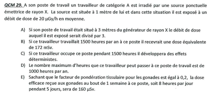 Solution Evely53 Posted November 17, 2015 Solution Posted November 17, 2015 Coucou, alors en ce qui concerne le 29: a) Faux le débit qu'émet une source est constant puisque c'est une quantité d'énergie (dose) émise par unité de temps donc la distance n'est pas un facteur. b ) Faux le travailleur fait 1500 heures, sachant que pour chaque heure il prend 20microGy, on multiplie 1500 par 20, ça fait 30 000microGy en tout soit 30mSv (Gy et Sv étant interconvertibles) et non pas 172mSv c) Faux c'est au bout de 1Gy ou 1Sv que l'on développe des effets déterministes d) Vrai comme pour la c) on calcul la dose totale donc 1000 x 20= 2000 microSv donc 20mSv, ce qui est en effet la limite annuelle pour un travalleur ( tableau p.66 du poly de physique) e) Vrai au bout de 5 jours le travailleur travaille 8x5= 40 heures donc il est d'irradié d'une dose de 20 x 40= 800microSv la formule de la dose éfficace est E= Wt x Dose donc on a E= 0.2 x 800= 160microSv pour le 30) a) Faux lors d'un effet Compton il n'y a pas, par définition, une absorption totale b ) Vrai le pic 2 a une énergie de 1.2Mev donc le pic 1 a une énergie légèrement supérieure et si tu mesure la distance entre le pic 1 et 2 tu voit qu'elle est égale à la distance entre l'axe des ordonnés et le pic 3 qui représente 511kev (je rappelle que l'énergie se lie sur l'axe des abscisses) donc l'énergie du pic 1 est de 1711 kev. c) Faux l'élément 3 ne correspond qu'aux Compton d'annihilation de 511 Kev c'est l'élément 2 qui correspond aux Compton des gamma de 1.2Mev d) Faux ce n'est pas le Sodium qui est excité mais le Néon puisque le gamma est du à une désexcitation du noyau fils (piège classique ^^) sinon le reste est juste e) Faux l'équivalent énergétique de la différence de masse revient à: 550 kev (B+ max) + 1200 kev (gamma de désexcitation) + 1022 kev (seuil de la B+) = 2772 kev et on 1750kev ( résultat qui omet le seuil) Voilà j'espère que mes réponses sont claires, Bon courage pour le concours!