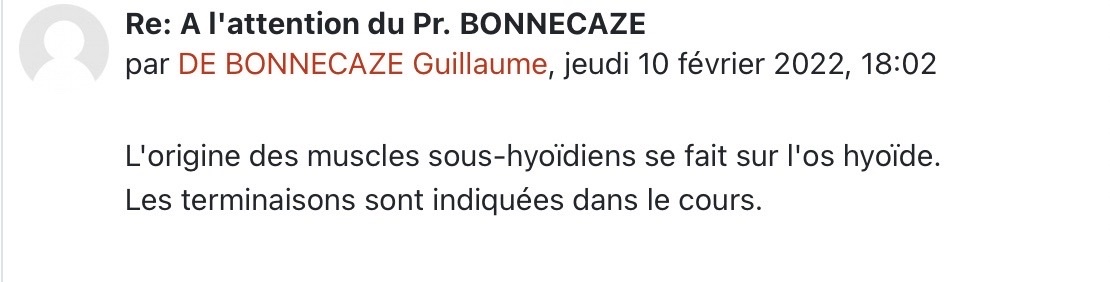 PassPartout_ Posted February 19, 2022 Posted February 19, 2022 Bon je suis un peu en retard mdr mais je viens de voir cette réponse de notre prof au message d'une étudiante, mais on est d'accord que c'est sensé être l'inverse non ? Est-ce que ça veut dire qu'on doit tout inverser du coup ? C'est peut être moi qui n'ai pas de bonnes fiches mais en tout cas j'ai noté que c'est la terminaison de ces muscles qui se fait sur l'os hyoïde.. Je suis perdue help en plus c'est totalement contradictoire avec ses diapos Quote
