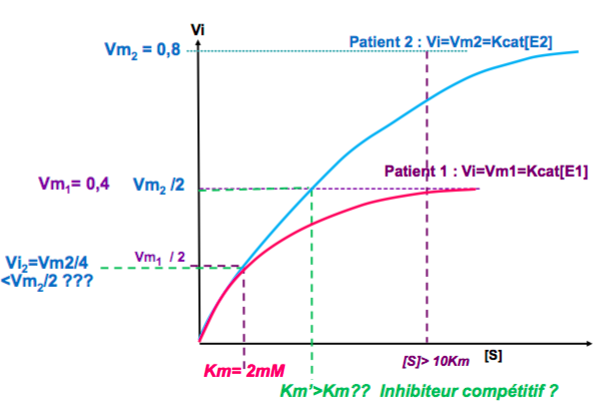 Pour le patient 1, à 2mM= Km, on a Vi=0,2 et Vmax= 0,4 donc il n'y a pas d'inhibiteur compétitif car il n'y a pas modification du Km.
