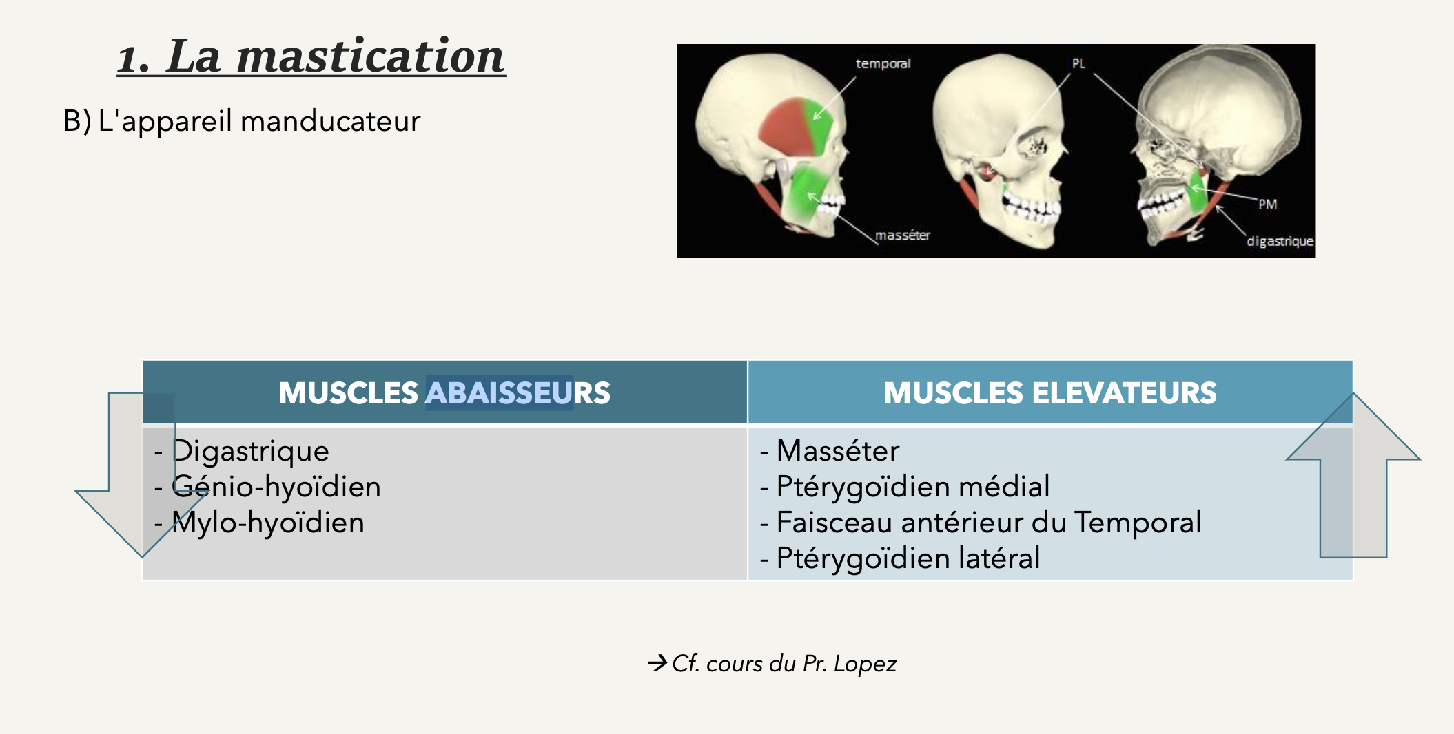Ancien Responsable Matière bunot Posted March 6, 2022 Author Ancien Responsable Matière Posted March 6, 2022 il y a 4 minutes, Chpoum a dit : Si c'est le diapo du cours sur la mastication du Dr Canceil qui repond à ta question c'est crédible (on l'a pas eu mais vu que t'es tétu..) => + diapo 6 si t'es curieux : On distingue les muscles élévateurs de la mandibule, les muscles abaisseurs de la mandibule et les muscles diducteurs. https://zupimages.net/up/22/09/yk2r.png Chuis d'accord ils ont un rôle dans la mstication, mais où s'est écrit explicitement qu'ils sont masticateurs ? Il me semble quand on a fait le cours de Lopez sur les masticateurs (qui lui tombe au concours) on a pas vu les abaisseurs si ? Quote