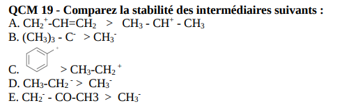 Solution Camlarousse Posted March 7, 2022 Solution Posted March 7, 2022 Salut!! Ce qu'il faut savoir pour commencer c'est que: - Pour les carbocations, + ils sont substitués + ils sont stables. Donc un carbocation tertiaire est + stable, qu'un carbocation secondaire, qui est plus stable qu'un carbocation primaire. - Et pour les carbanions, - ils sont substitués + ils sont stables. Donc un carbanion primaire est + stable qu'un carbanion secondaire, qui est + stable qu'un carbanion tertiaire. Donc à partir de ces connaissances là: A. On nous met qu'un carbocation primaire est + stable qu'un carbocation secondaire. C'est l'inverse donc c'est faux. B. On nous met qu'un carbanion tertiaire est + stable qu'un carbanion primaire. C'est l'inverse aussi donc c'est faux. C. Ici, on a 2 carbocations primaires. Sauf que le méthylbenzène chargé + est stable car on a une forme mésomère. C'est ce qui est dit ici, donc l'item est vrai. D. On nous met 2 carbanions primaires. Les carbanions sont stabilisés par la présence de groupements attracteurs d'électrons. Or, on en a pas ici. Par contre, on sait que le CH3 a un effet donneur qui lui va déstabiliser la molécule. Donc CH3-CH2- sera moins stable que CH3-. C'est pas ce qui est dit ici, donc l'item est faux E. On nous met encore 2 carbanions. Le groupement cétone est un groupement attracteur donc stabilisateur de carbanion. On nous dit justement que le carbanion porteur de la cétone est + stable que CH3- donc l'item est vrai. Voilà j'espère que ca t'a aidé! mina184 and columbo 2 Quote