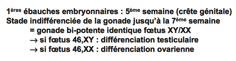 Guest LaureA Posted November 19, 2013 Posted November 19, 2013 Bonsoir, Je ne sais pas ce que les profs vous ont dit cette année, mais pour ma part j'ai : Gonade indifférenciée à la 6e semaine, Début de différenciation testiculaire à la 7e sem Puis, début de différenciation des ovaires à la 8e sem Donc en effet, la différenciation testiculaire précède l'ovarienne. Je n'ai pas compris ta question sur SRY.. ^^" Tu peux reformuler ? Courage !