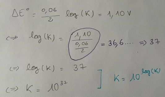 Solution Pucca Posted October 8, 2022 Solution Posted October 8, 2022 Il y a 1 heure, Maheva_med a dit : J'arrive pas à comprendre comment on se "débarrasse" du log dans le calcul de K pour n'avoir que K d'un côté @Maheva_med, je t'ai détaillé le calcul mais par contre je ne comprend pas du tout d'où sort le 1,94, @Au-ccipital aura sûrement la réponse. En tout cas ce qu'il faut savoir c'est que la fonction inverse du log c'est 10 puissance (je te l'ai écrit en bleu). Je pense que tu auras compris le passage de la première à la deuxième ligne, on "passe" 0,06/2 de l'autre côté en divisant 1,10 par cette fraction et en arrondissant on trouve 37. Et après tu mets à la puissance 10 pour te retrouver qu'avec K, qui d'ailleurs j'ai oublié de l'écrire, est égal à [Zn2+]/[Cu2+]. Après désolée j'ai pas compris d'où sortais le 1,94. Au-ccipital 1 Quote