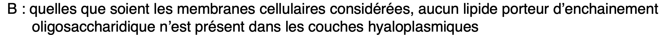 Je pense que c'est parce que dans ton cours, on te dit que ce sont les lipides membranaires qui peuvent être glycosylés. Dans cet item, on te parle de hyaloplasme qui fait référence au cytoplasme. Donc tu ne pourras pas trouver de lipides glycosylés au niveau du hyaloplasme.