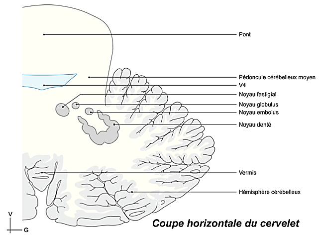 Solution Pikachumab Posted October 16, 2022 Solution Posted October 16, 2022 Salut @Marmotte, J'espère avant toutes choses (et explications) que tu vas bien ! Donc comme tu sais sûrement, le cervelet est une structure supra-segmentaire qui provient de la partie dorsale du métencéphale. On le retrouve donc en arrière du tronc cérébral. En vue ventrale, on peut donc voir différents sillons ainsi que des pédoncules cérébelleux. Entre ceux-ci on retrouve le 4ème ventricule et les cavités : de la moelle allongée, du pont et du cervelet. C'est particulièrement sur cette vue qu'on va pouvoir observer le nodulus et le flocculus. D'ailleurs en passant, le nodulus est relié au flocculus et on parle donc de lobe flocculo-nodulaire. Passons donc au noyau fastigial (kessesé). Cette fois ci en vue horizontale on va pouvoir observer le pont, le pédoncule cérébelleux moyen, le vermis et un hémisphère du cervelet. Autour de cette "cavité" (4eme V), on pourra observer de la substance grise organisée en noyau (3 qu'on va détailler et qui sont des amas de neurones) : - un en dedans qu'on appeler le noyau fastigial - puis le noyau interposé qui est en dehors avec 2 parties : le globulus (médial) et l'embolus (latéral) - Enfin le noyau denté qui est plus latéral. J'espère que tu as réussi à les situer et à comprendre ce que c'était ! Je laisse @Zeepek confirmer ma réponse et j'espère qu'elle aura pu t'éclairer N'hésite pas ! Zeepek, davidd and Marmotte 2 1 Quote