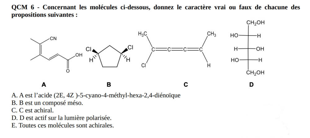 Solution brebicuculline Posted October 27, 2022 Solution Posted October 27, 2022 Coucou @lucie_vsr, Alors je vais essayer de reprendre item par item pour que tu comprennes bien Pour l'item A, Il faut dans un premier temps que tu repères la chaine carbonée principale. Il y a 6 carbones d'où le radical -hexa. Tu as un méthyl sur le carbone 4. Puis tu repères la fonction prioritaire d'après le tableau qui hiérarchise les différentes fonctions (ici c'est l'acide carboxylique). D'où la nomenclature "acide .... -oïque" Il y a aussi une fonction non prioritaire : le nitrile. Il est relié au carbone 5 : pour sa nomenclature on aura "5-cyano". Ensuite tu t'occupes des liaisons des alcènes, il y en a 2 ("2,4-dién") : une au carbone 2 (en E) et une au carbone 4 (en Z). Ce qui donne l’acide (2E, 4Z )-5-cyano-4-méthyl-hexa-2,4-diénoïque Pour l'item B, tu as bien un composé méso. Tous les paramètres sont regroupés pour l'affirmer : 2 carbones asymétriques de configuration inverse (un R et un S ) et un plan de symétrie (ton carbone au milieu a les mêmes substituants). Pour l'item C, tu as 3 doubles liaisons : d'après le cours il n'y a donc pas de chiralité car les substituants sont dans le même plan. (je te remets la diapo) Révélation Voilà je laisse @Au-ccipital finir les derniers items ;)) N'hésite surtout pas si tu as des questions, je n'ai pas tout détaillé car je ne savais pas précisément où étaient tes incompréhensions ! Courageee :)) MonosPASS, Au-ccipital, lucidre and 1 other 4 Quote