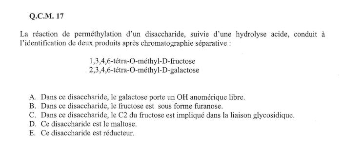 Solution mimoma Posted January 5, 2016 Solution Posted January 5, 2016 Si le galactose portait son OH anomérique libre alors hormis le C1 (car il ne pourra jamais porter de O-méthyl après l'hydrolyse acide qui rompt la liaison glycosidique), il devrait y avoir deux autres carbones du galactose ne portant pas de O-méthyl (l'un car participant à la cyclisation interne ici C5 et l'autre car lié au fructose). Or il n'y a que C1 et C5 qui ne portent pas de O-méthyl donc c'est bien l'OH anomérique du C1 du galactose qui participe à la liaison avec le fructose (donc non-libre) Quoi qu'il en soit, pour un aldose sous forme cyclique après ces deux réactions le C1 ne peut pas avoir de O-méthyl , même si le OH anomérique était libre.