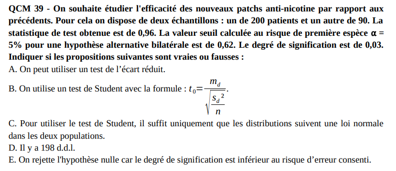 Ancien Responsable Matière Flèche Posted December 1, 2022 Ancien Responsable Matière Posted December 1, 2022 Coucou @maë_81 ! il y a 5 minutes, maë_81 a dit : Pourtant, je viens de tomber sur un qcm où la correction dit "Dans le cas d'une comparaison de moyennes entre deux échantillons, on utilise plutôt un test de Student" Et dans le qcm, les effectifs étaient supérieurs à 30, c'est pour ça que je me pose la question... Enft dans le cas où l'effectif est supérieur à 30 tu peux utiliser les deux tests (Student ou écart réduit). Le choix se fera ensuite en fonction des données de l'énoncé. En résumé : n < 30 => forcément test de Student n > 30 => test de Student ou de l'écart réduit en fonction des données à disposition C'est dans quel QCM que tu as trouvé cet item ? Peut-être qu'avec l'énoncé on pourra essayer de mieux t'expliquer pk on a choisi le test de Student plutôt que celui de l'écart réduit. Mais en vrai personnellement j'avais remarqué qu'on utilise très souvent le test de Student. N'hésite pas si tu as des questions ! thelonelymountain and paulined 1 1 Quote