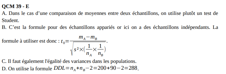 maëlysosome Posted December 1, 2022 Author Posted December 1, 2022 Pourtant, je viens de tomber sur un qcm où la correction dit "Dans le cas d'une comparaison de moyennes entre deux échantillons, on utilise plutôt un test de Student" Et dans le qcm, les effectifs étaient supérieurs à 30, c'est pour ça que je me pose la question... Quote