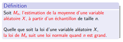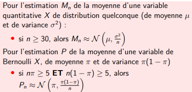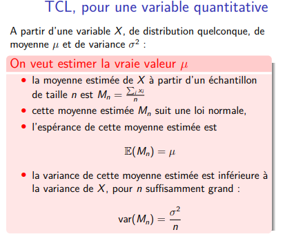 Ancien Responsable Matière Movgde Posted December 4, 2022 Ancien Responsable Matière Posted December 4, 2022 Salut @Selm ! Comment Si n est grand l'estimation de la moyenne µ dans la population suit une loi normale avec une espérance E(X)= µ et une variance Var(X) = σ²/n. De plus si tu veux estimer une proportion π dans la population, si n est grand alors ton estimation suit une loi normale avec une espérance E(X) = π et une variance Var(X) = π(1-π)/n. Les conditions d'applications sont alors n > 30, et dans le cas où à la base tu avais une loi de Bernoulli n*pi > 5 et n(1-pi) > 5. Quand Dès que t'as une loi continue qui n'est pas centrée réduite (tu devras quasiment jamais le faire, juste connaitre le théorème suffit). Pourquoi Cela te permet de généraliser/simplifier les formules, en gros toutes tes lois continues devient des loi normales, donc pas mal de propriétés intéressantes. De plus elle est toujours centrée sur 0 avec une certaine espérance (comme elle est réduite aussi), cela permet de savoir facilement les intervalles où 95% des valeurs sont dedans par exemple. Si t'as besoin de plus de précision sur un point n'hésites pas ! totov31, Selm, Takotsubo and 2 others 3 2 Quote