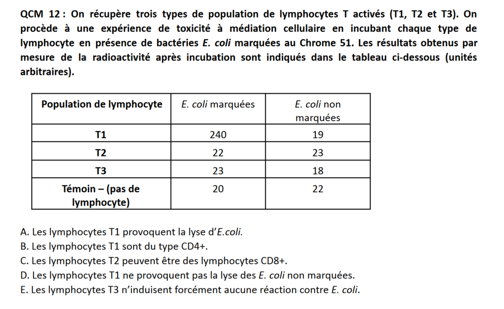 Élu Etudiant Solution the_last_dandelion Posted February 13, 2023 Élu Etudiant Solution Posted February 13, 2023 Coucou @Pitbull2pétanque ! Alors, avant de partir sur les items de ce QCM, il faut bien comprendre l'énoncé : on te dit qu'on a 3 types de population de lymphocytes activés (qui peuvent donc participer activement à la réponse immunitaire), et on a aussi des bactéries E. Coli marquée au Chrome 51, un élément radioactif. Cet élément se trouve au sein de la bactérie (marquage des bases de l'ADN généralement) , donc pour que l'élément radioactif soit détecté, il faut que la bactérie soit lysée (libération du Chrome 51, maintenant détectable). Et maintenant qu'on a compris ça, les items sont beaucoup plus simples à résoudre : A : VRAI : Tu compares les colonnes de ton tableau : la seule case qui sort de l'ordinaire (par rapport à l'expérience témoin) est celle de la mesure de la radioactivité pour les bactéries marquées en présence des lymphocytes T1 où la mesure de la radioactivité est beaucoup plus importante qu'ailleurs --> beaucoup de radioactivité détectée = beaucoup de Chrome 51 libéré = beaucoup d'E. Coli lysées. Les lymphocytes T1 provoquent la lyse des E. Coli. B : FAUX : Les lymphocytes CD4+ sont des lymphocytes helpers, ils coordonnent la réponse immunitaire (sécrétion de cytokines), ils ne lysent pas les cellules. Ce sont les lymphocytes CD8+ qui sont cytotoxiques. C : VRAI : Effectivement, les mesures de l'expérience indiquent que les LT2 ne lysent pas les E. Coli. CEPENDANT, les LT2 peuvent tout de même être cytotoxique CD8+, mais avoir un récepteur TCR qui n'est pas dirigé contre les E. Coli (spécifique d'un autre antigène). D : FAUX : Ils provoquent aussi la lyse des E. Coli non marquées, simplement, comme elles ne sont pas marquées, on ne peut pas mesurer la radioactivité libérée. E : FAUX : L'expérience permet seulement de dire que les LT3 ne lysent pas les E. Coli. Les LT3 pourraient être des lymphocytes CD4+ reconnaissant les E. Coli et libérant des cytokines en correspondance, mais ce n'est pas mesuré sur cette expérience donc on ne peut pas savoir. J'espère que c'est assez clair, n'hésite pas si tu as d'autres questions :)) Pitbull2pétanque, barbiedocteur, emylyyy and 1 other 2 2 Quote