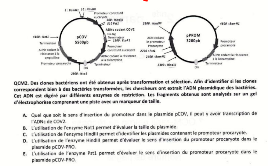 Ancien Responsable Matière Solution Cassolnousmanque2 Posted February 18, 2023 Ancien Responsable Matière Solution Posted February 18, 2023 Re coucou @khaled, je vois des plasmides, j’accours ;) C) Si tu as une insertion du promoteur procaryote, alors après coupure par HindIII tu auras un fragment de 800 pb (correspond à la taille de l’insert (3100-2300 = 800)) + tu auras un deuxième fragment qui correspond au reste du plasmide Au contraire, si tu n’as pas d’insertion du promoteur procaryote, alors après coupure par HindIII, tu auras un fragment de 490 pb (correspond à la « distance en pb » entre les deux sites de restriction pour HindIII (500-10 = 490)) + tu auras un deuxième fragment qui correspond au reste du plasmide -> en fonction de l’insertion du promoteur procaryote ou non, tu vois bien que la taille des fragments que tu obtiens est différente -> donc l’item est vrai D) Comme tu réalises un clonage non orienté, tu ne peux pas déterminer le sens d’insertion de l’insert en utilisant Hind III Peu importe le sens, tu auras toujours un fragment de 800 pb -> donc l’item est faux E) Tu remarques que le site de restriction pour Pst1 présent sur l’insert est situé pile au milieu de cet insert Tu le vois par le calcul : 3100 - 2700 = 400 pb et 2700 - 2300 = 400 pb Par conséquent, en utilisant cette enzyme de restriction, tu ne sauras pas dans quel sens l’insert s’est inséré dans le plasmide pCOV-PRO -> donc l’item est faux Révélation Par contre je viens de voir un détail qui n’est pas cohérent dans l’énoncé… Sur le plasmide pPROM qui fait 3200 pb, on a un site de restriction à 4600 pb pour BamH1, ce qui n’est pas possible ;)) TutMarion, emylyyy and khaled 2 1 Quote