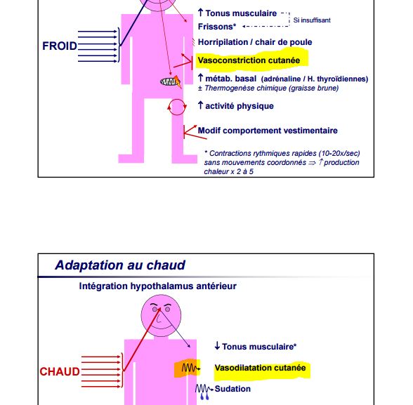 chikli Posted February 25, 2016 Posted February 25, 2016 une obstruction des pores c'est un peu un variation de l'épaisseur à traverser (quand ya rien ça passe toujours mieux que quand ya quelques chose ) , sinn tu chipotes un peu , c'est du cours mot à mot (il aurai pu ajouté évaporation ) =>autre vison des choses : vasoconstriction cutanée isolation thermique (baisse de la conductance) du noyau centrale et des viscères profond vis à vis de la température cutanée du coup moins de déperdition ceci pourrai être expliqué par différents concept physique qui ne sont pas développés dans le cadre de ce cours