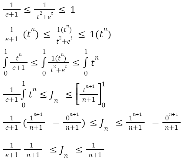 En gros en aprtant de l’encadrement juste avant, tu multiplies par t^n, ensuite comme à gauche et à droite tes fonctions sont continues, integrables…., tu peux intégrer chaque partie de ton encadrement, comme ça au milieu tu te retrouves avec Jn, et a gauche et à droite avec deux intégrales que t’es capable de calculer (ce qui permet de faire apparaître les 1/(n+1) ).