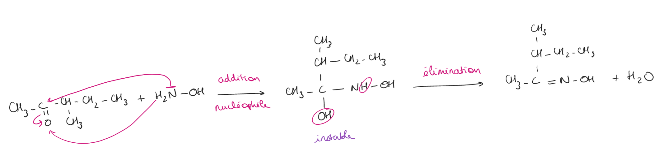 Solution Pucca Posted March 13, 2023 Solution Posted March 13, 2023 @ArtiPasChaud C'est bien ça pour la molécule A, voilà ce qui se passe ensuite : Donc on dit que c'est une réaction d'addition élimination car tu as addition par N puis élimination de H20, ça marche pour tous les composés cités dans la correction item C. Et j'ai oublié de l'annoter mais à la fin, il y a isomérie Z/E et dans notre cas on a 1C* mais qui normalement a gardé la même configuration de départ, donc j'aurai dit qu'il se forme 2 stéréoisomères ArtiPasChaud and emmalasseug 1 1 Quote