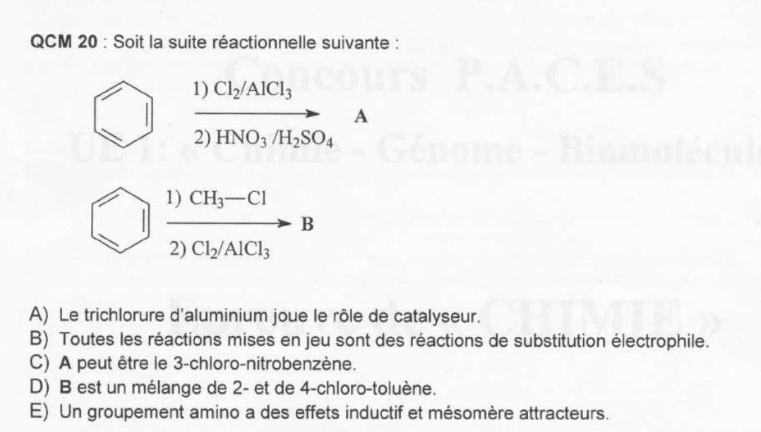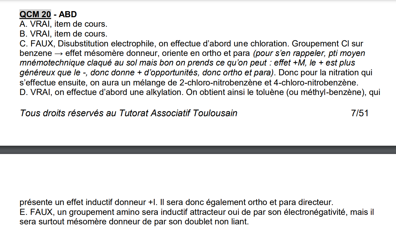 Justidhine Posted March 16, 2023 Posted March 16, 2023 il y a 5 minutes, Passover a dit : merci pour ta réponse <3, juste dsl je viens de faire l'exo du dessous et du coup je ne comprends pas pourquoi l'item d est juste https://zupimages.net/viewer.php?id=23/11/slc5.png Alors , dans un premier temps tu vas ajouter ton méthyl sur ton benzene, puis tu vas ajouter tes deux Cl sachant que CH3 est ortho et para directeur tu vas bien obtenir le 2 et 4 chloro toluène. Si tu comprends pas pourquoi on ajoute les 2 chlore c'est parce que tu es en présence de AlCl3 et Cl2 Passover and BarbaPass 1 1 Quote