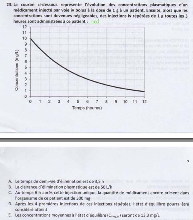 Solution Broctus Posted April 1, 2016 Solution Posted April 1, 2016 Pour la photo un je pense que c'est parce que la demie vie n'est pas totalement deux fois dépassée au bout de 6H (elle est plus de 3.5H que de 3H cf Q.A) par conséquent, il reste encore un peu plus que 250 mg de médicament. Photo 2: tu n'a pas besoin de t'embêter avec l'ASC tu trouves la clairance avec la formule CSS=vitesse de perfusion initiale (cf enoncé)/Cl