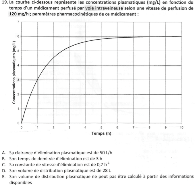 Solution PierreJ-F Posted April 6, 2016 Solution Posted April 6, 2016 Bonsoir, Pour la réponse A, on sait que 80% de la clairance est rénale et elle est égale à 40 ml/mn. On cherche donc la clairance totale c'est à dire 100%. Grace à un produit en croix on obtient : (100x40)/80 = 50 ml/mn. Pour la réponse B, on cherche l'élimination rénale en mg/h, sachant qu'en 24h 1,6L d'urine est émis donc en 1h : 1,6/24 = 0,066 L. La concentration urinaire est de 12mg/l, nous avons 0,066L d'ruine par heure --> 0,066 x 12 = 0,8 mg/h. Les réponses C et D sont des notions de cours, les suppositions dans la formulation es items permet entre autre de répondre vrai.