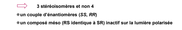 Méso : Lorsque 2 C* ont les mêmes substituants et qu'ils ont une configuration opposée, ont dit que la molécule est méso et dans ce cas elle contient 1 SEUL stéréoisomère. Elle est achirale car on peut dessiner un plan de symétrie (entre les 2C*) donc optiquement inactive