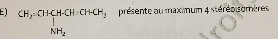 Bonsoirrrr, je bloque fort sur un QCM, les item ACE sont compté vrai mais meme en me representant la molecule dans l'espace je n'y arrive pas. Avec la formule je trouve pour l'item A seulement 2 stereoisomere car je ne vois qu'une isomerie Z ou E et pas de carbone alpha, pour l'item C et E pareil. SI quelqu'un peut m'aider je suis preneuse. Et ya t'il une nuance entre "forme differente" et "nombre de stereoisomere" . Merci beaucoup!!!