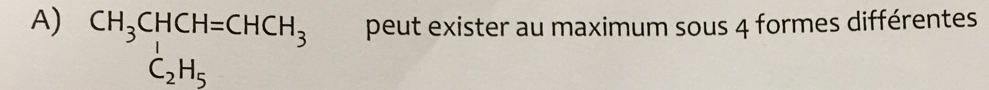 Pour l'item A, tu as 2 carbones asymétrique: celui qui est lié au C2H5 et le premier carbone du C2H5. Par conséquent tu peux appliquer la formule donnée en cours qui dit qu'il y a 2**le nombre de carbone asymétrique. Ici on aura 2**2 = 4. Je te conseille de dessiner la forme développée de la molécule pour mieux la visualiser. Attention les stéréoisomères s'observent avec les carbones asymétrique, ils n'ont rien à voir avec les doubles liaisons.