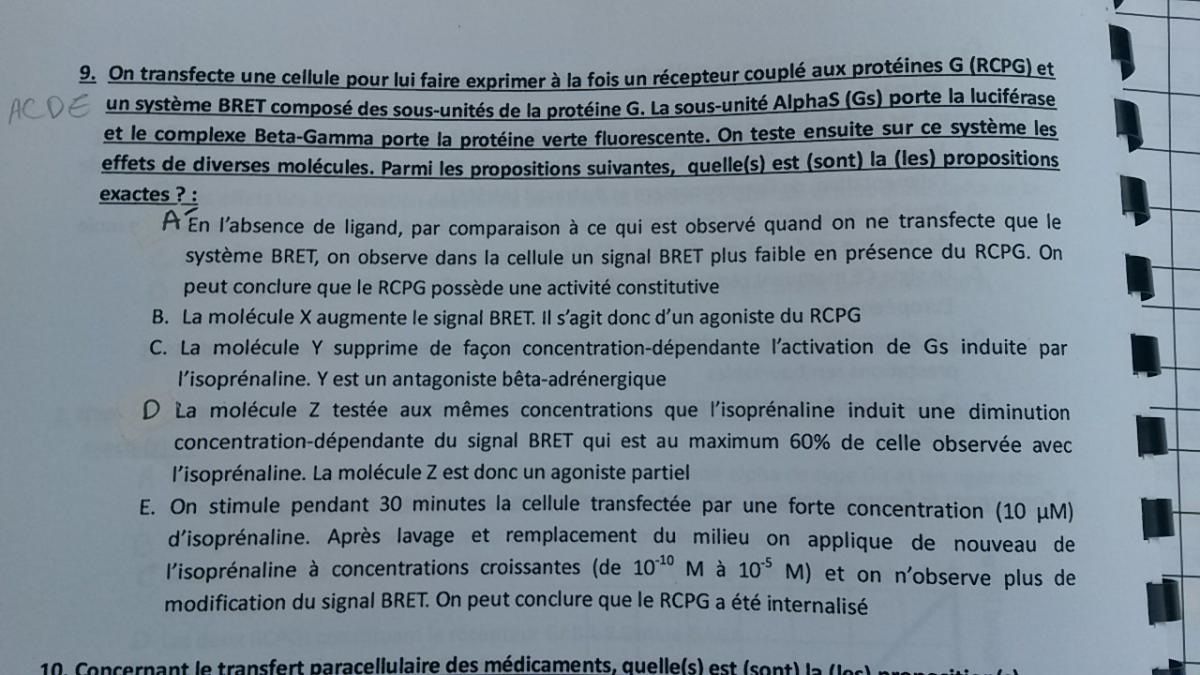 bdarchy06 Posted April 19, 2016 Posted April 19, 2016 pour le 2e qcm: il faut tout d'abord bien comprendre ce qu'est le système BRET. En fait c'est un peu comme le FRET vu au 1e quad: 2 constituants sont greffés avec des molécules qui émettent un signal particulier (ici signal BRET) si elles sont assez proche. ça sert à montrer l'interaction des deux constituants. du coup pas d'interaction = pas de signal -A: d'après ce qu'il est dit, sans ligand, le signal BRET est moins fort dans la cellule que lorsque le système est seul (genre in vitro seul dans son éprouvette). donc moins de signal = moins d'interaction des sous unités = plus d'activité car protéine G dissociée. activité dans la cellule meme sans ligand --> activité constitutive......VRAI -B: comme vu au dessus, si X augmente le signal = diminue l'activité. c'est donc un antagoniste....FAUX -C: alors là c'est du cours (diapo 12 du cours sur les RCPG) on voit bien que l'isoprénaline est un agoniste du r.beta 1 adrénergique (Gs) donc si Y est en compétition avec lui, c'est bien un antagoniste beta adrénergique...VRAI -D: l'isoprénaline est un agoniste entier et entraîne donc une diminution à 100% du signal BRET(= augmentation de 100% de l'activité intrascèque). donc si Z entraîne une diminution de 60% du signal = augmentation de 60% de l'activité. c'est donc bien un agoniste partiel.....VRAI -E: l'exposition des RCPG à leur ligand endogène ou agoniste de manière prolongée et importante provoque leur internalisation. c'est prouvé par le non modification du signal malgré l'exposition de la cellule à son agoniste (oui depuis le debut on parle du RCPG beta1 adrénergique) le récepteur n'est donc plus sur la membrane......VRAI voila j’espère que c'est clair! si je me suis trompée n'hésitez pas à me reprendre