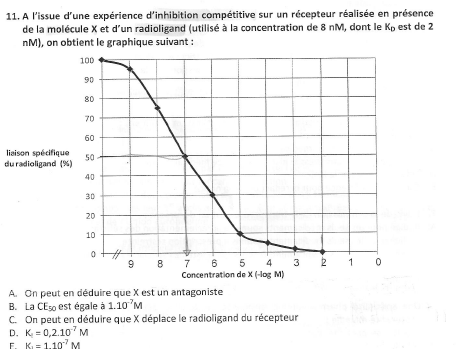 Solution Ellexa Posted April 26, 2016 Solution Posted April 26, 2016 Bonjour ! Pour la 12B, j'ai vu sur le poly du TAT que la liaison non spécifique se mesurait avec un ligand froid qui allait délocaliser le ligand radiomarqué + former des liaisons à d'autres endroits du récepteurs (liaisons donc non spécifiques et de faible intensité). (A préciser par un tuteur pê...) Pour le 26C je me pose la même question que toi ! Si un tuteur pourrait confirmer... Pour le qcm11, je ne saurai pas justifier la A, moi même je n'ai pas trop compris.. B: On parle d'un inhibiteur donc c'est la CI50=10^-7 C : La liaison spécifique diminue donc le radioligand est bien déplacé par l'inhibiteur D et E : Application de la formule KI = CI50/1+([L]/Kd) Voilà j'espère t'avoir un peu aidée pour ce QCM ^^