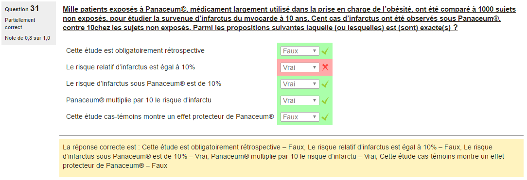 Clemsoin Posted April 27, 2016 Posted April 27, 2016 C'est un petit piège : On a 10 fois plus de risque d'avoir la maladie lorsqu'on est exposé à Panaceum. Le Risque Relatif est donc égal à 10. (Et non pas 10% soit 0,1)