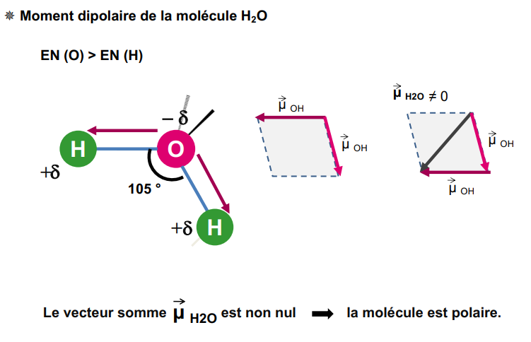 Solution Wisaldehyde Posted November 19, 2023 Solution Posted November 19, 2023 (edited) Coucou @Alma15 Voici la méthode pour determiner le moment dipolaire: 1) Dessiner la molécule en respectant sa géométrie (structure de Lewis ou VSEPR) 2) Identifier la polarité de chaque atome de la molécule ( l'électronégativité augmente vers la droite et le haut du tableau périodique avec F l'atome le + electronégatif): on note delta- l'atome le plus électronegatif et delta+ le moins electronégatif 3) Tracer les vecteurs allant de l'atome delta- à celui delta+ 4) Sommer les vecteurs: Les vecteurs s'annulent: la molécule est apolaire Les vecteurs ne s'annulent pas: la molécule est polaire Je te mets ci-joint des images du cours qui te permettront de mieux visualiser: Et enfin un petit rappel pour la géométrie des molécules : J'espère que tu comprends mieux maintenant! N'hésites surtout pas si t'as d'autres questions! Bon courage Edited November 19, 2023 by Wisaldehyde Enzodiazépine and NIcotine 2 Quote