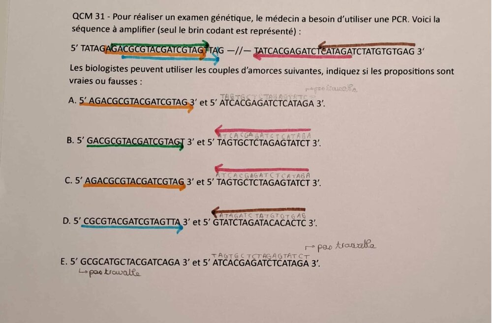 FuturDocteurMamourV2 Posted December 6, 2023 Posted December 6, 2023 Il y a 2 heures, Thomas.chem a dit : Salut, ce genre de qcm est important à savoir faire car il tombe toujours ! Vous avez vu comment résoudre cela dans le TD 3. je te remet les diapos qui t'expliquent comment faire, mais va jeter un œil au td3 pour tout avoir en précision. Sans rentrer dans le pourquoi du comment, dans ces qcms: la première amorce que l'on va te proposer, on va la comparer avec le côté 5' de ta séquence codante (en allant donc vers le 3'), en cherchant la séquence identique que ton amorce (en partant du 5'). Pour la deuxième amorce, on va faire le complémentaire du côté 3' de la séquence codante. On va ensuite en partant du côté 5' du COMPLEMENTAIRE (en allant donc vers le 3'), chercher la séquence de l'amorce (en partant de 5'). Les schémas te résument bien cela ! Salut ! Merci beaucoup pour ces polys et le temps que vous prenez pour nous ! Désolé de te solliciter à nouveau @Thomas.chem mais je suis plutôt d'accord avec @Leroidespates j'ai beau avoir refait ce QCM plusieurs fois avec le cours, le TD et tes explications je ne comprend pas toujours pas comment B, C et D peuvent être vrai. J'ai aussi cette impression Il y a 9 heures, Leroidespates a dit : j'ai l'impression que les amorces ne sont pas dans le bons sens, que 5' et 3' sont échangées... J'ai tout recopié et refait en couleur pour en être sur mais je tombe toujours sur le même résultat. Voici comment j'ai fait. https://zupimages.net/viewer.php?id=23/49/yifo.jpg Si jamais ce n'est vraiment pas une Errata est ce que si tu vois mon erreur qui doit être la même que @Leroidespates tu pourrais nous expliquer ce qui cloche dans notre raisonnement ? Merci et bonne soirée ! Quote