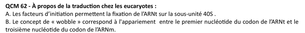 titoulou Posted December 3, 2023 Posted December 3, 2023 Bonjour, dans ce qcm: QCM 20 - À propos du cadre de lecture, voici une séquence codante d’ARNm qui va être traduite chez un eucaryote : 5’ AUG UUC ACA GAA GAU UAA ACG 3’ : A. Le dernier acide aminé traduit sera une thréonine. B. En remplaçant la dixième base par une uracile (U), on aurait une mutation non-sens. C. Une délétion de la huitième base entraîne un décalage du cadre de lecture. D. Si la douzième base était une guanine (G), il est certain que cela n’aurait pas d'impact sur la stabilité de l’ARNm. E. Cette séquence est représentative de la dégénérescence du code génétique. J'ai mis que le C était vrai mais la correction dis ça : QCM 20 - B A. Il s’agit d’un acide aspartique, il faut regarder celui juste avant le codon Stop. B. (VRAI) Cela nous donne un codon Stop. C. Seule une délétion d’un nombre de base qui n’est pas un multiple de 3 engendre un décalage du cadre de lecture. D. Même s’il s’agit d’une mutation silencieuse, elle peut avoir un impact sur la stabilité de l’ARNm. E. La dégénérescence signifie que plusieurs codons peuvent donner un même acide aminé. Or, il n’y a pas dans cette séquence des codons différents codants pour un même acide aminé. Or 1 n'est pas un multiple de 3? Ca devrait décaler le cadre non? Merci Quote