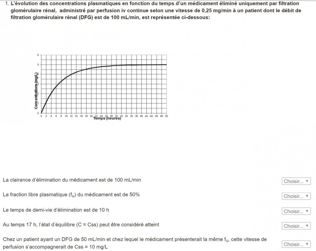 Solution Tyson Posted May 11, 2016 Solution Posted May 11, 2016 Salut , désolé pour le retard mais comme on dit mieux vaut tard que jamais. Tout d'abord il est dit dans l'énoncé qu'on est dans le cas d'une perfusion IV continue. Donc Css = R0 / CL avec Css la concentration à l'état d'équilibre et R0 la vitesse de perfusion. On peut voir graphiquement que Css = 5mg/L Donc on a CL = R0 / Css = 0,25/5 = 0,5 L/min ce qui fait 50 mL/min donc item A faux. Pour l'item B : Il est dit dans l'énoncé que le médicament est éliminé uniquement par filtration glomérulaire et que le patient a un DFG de 100mL/min, et on sait que : CLtotale = CLFG = DFG x fu = 50mL/min Donc fu = CLFG / DFG = 50/100 = 0,5 = 50% l'item B est vrai Pour l'item C : Il suffit de lire la demi-vie graphiquement : on peut par exemple prendre le temps nécessaire pour passer d'une concentration de 5 mg/L à 2,5 mg/L. On trouve un intervalle de 5h sur l'axe des abscisses. L'item C est faux Pour le D tu as raison, on voit sur le graphique qu'on a atteint l'état d'équilibre au bout de 17h. Item D vrai Pour l'item E, il faut d'abord calculer la CL en prenant un DFG de 50 mL/min (sachant que c'est le même médicament et qu'il n'est éliminé que par fitration glomérulaire) : CLtotale = CLFG = DFG x fu = 50 x 0,5 = 25mL/min = 0,025 L/min On peut maintenant calculer Css = R0 / CL = 0,25 / 0,025 = 10 mg/L donc l'item E est vrai Voilà pour ce QCM