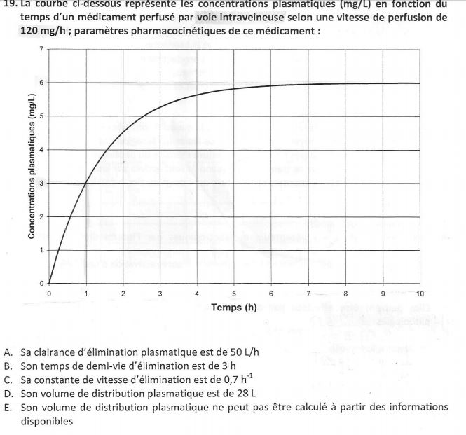 Solution Tyson Posted May 11, 2016 Solution Posted May 11, 2016 Bonjour On est dans le cas d'une perfusion IV continue donc Css = R0/CL On peut lire graphiquement que Css vaut 6 mg/L et on sait (énoncé) que R0 vaut 120 mg/h. Donc on a CL = R0/Css = 120/6 = 20 L/h Pour trouver la demi-vie tu peux chercher le temps nécessaire pour parvenir à Css/2 (sachant qu'il est facile de trouver Css) On voit graphiquement qu'il faut 1h pour arriver à Css/2 donc T1/2 = 1h Maintenant qu'on connait la demi-vie on peut calculer sa constante de vitesse d'élimination k = 0,7 / T1/2 = 0,7 / 1 = 0,7 h-1 On sait que T1/2 = 0,7 x Vd / CL donc Vd = T1/2 x CL / 0,7 = 1 x 20 / 0,7 = 28L Les réponses vraies étaient donc CD