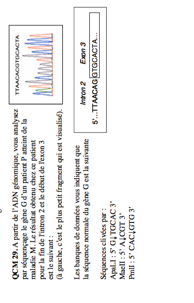 Ataraxie Posted December 6, 2013 Posted December 6, 2013 Bonsoir, Je suis en train de faire des QCMs sur les techniques en génome. Je travaille sur le concours de Janvier 2011 dont je vous poste l'énoncé du QCM. Les items comptés vrais sont le A et le D dans les corrections. Or je trouve B et C quand je résous le problème. Déjà, je ne comprends pas pourquoi les derniers nucléotides de l'intron 2 sont 5'... TTACAG pour le patient P. Si on regarde le premier encadré avec les pics du séquençage du gène chez le patient atteint de la maladie, j'ai plutôt l'impression qu'il y a une mutation sur le nucléotide G (de la séquence normale) qui devient C. Le G étant le dernier nucléotide présent dans une séquence normale de l'intron 2 comme indiqué dans le second encadré. Donc pour moi la A est fausse A partir de là, évidemment je trouve la réponse B juste (puisque je considère que la A est fausse). Donc comme chez le patient malade on a la séquence 5'... TTAACACGTGCACTA , je trouve logique qu'un site de restriction soit créé pour l'enzyme MaeII qui cliverait ici : 5' ... TTAACA / CGTGCACTA . Chez le sujet normal, comme il n'y a pas ce C , pas de possibilité de coupure. Donc pour moi l'item C est vrai. Par conséquent le D est faux. Alors sois je me suis plantée au début et donc tout le raisonnement est inversé soit il y a une erreur dans la correction fournie. Si quelqu'un pouvait m'expliquer.... Merci beaucoup!