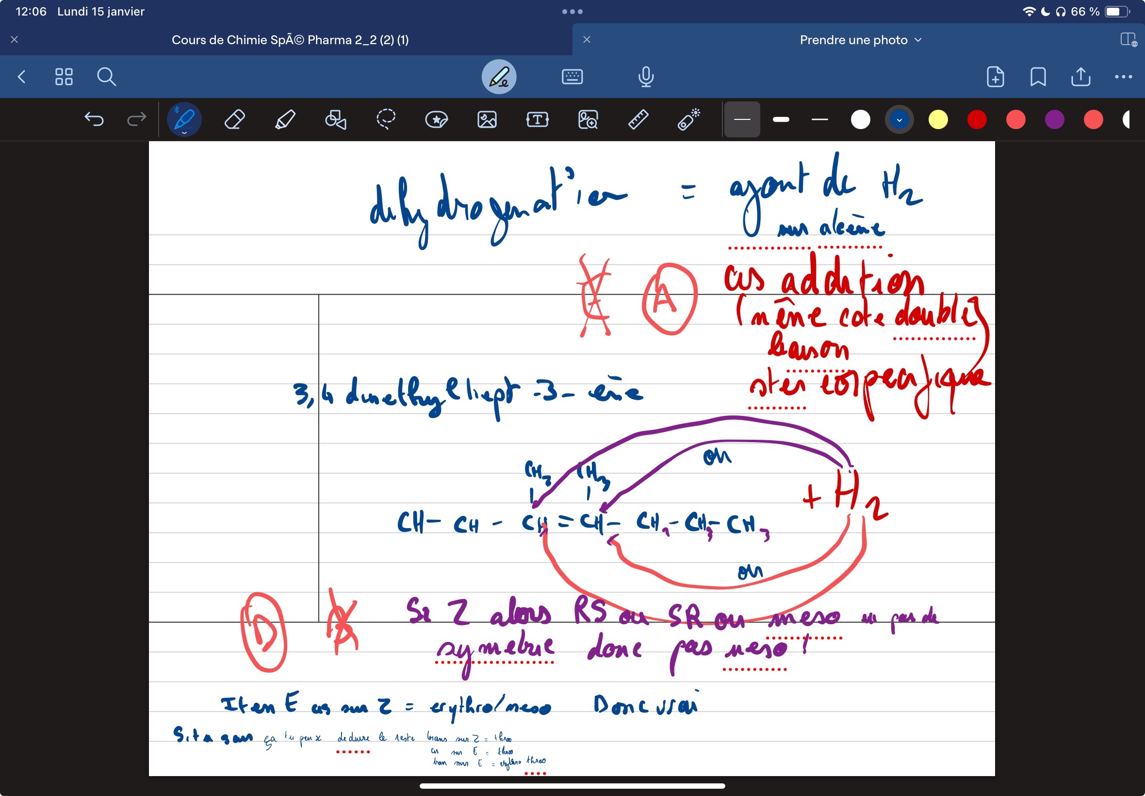 TheoPF Posted January 16, 2024 Posted January 16, 2024 Il y a 12 heures, davidd a dit : Hey j'aurais mis ADE Bonne journée a toi hesite pas si tu as des question ou des truc que tu arrives pas a lire ( j'ai essayé de m'appliquer mais meme comme ça je conçois que j'ecris mal ) Pas la E chef, hydrogénation catalytique c'est toujours une cis addition. En gros t'as les 2H qui sont fixés une plateforme métallique, donc ils sont sur la même face et ils sont récupérés en même temps, donc ils vont se fixer sur la molécule du même côtés (cis addition). Tu peux le voir sur la diapo 46 @0501159404 Antoibaïne and Thomastocyte 2 Quote