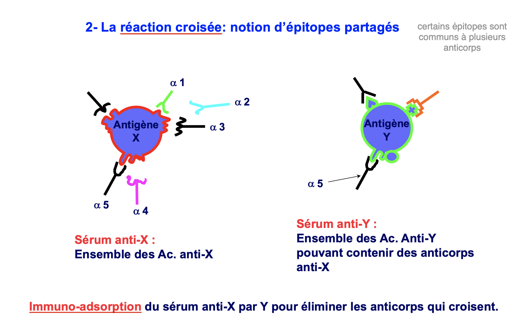 Solution Vector Posted February 7, 2024 Solution Posted February 7, 2024 (edited) Heeey @mathoulematou ! Pour répondre à ta première question, je te mets en pj le schéma de l'immuno-adsorption. Pour comprendre cette expérience, il faut se souvenir que des antigènes différents peuvent contenir des épitopes identiques (ce qui change c'est la position et le nombre de ces épitopes). Il existe donc des anticorps qui reconnaissent des antigènes différents parce qu'ils présentent le même épitope (= épitopes partagés). Ici c'est le cas de l'anticorps alpha-5 qui reconnait le même épitope sur les antigènes X et Y. Ainsi si on veut avoir une solution ne contenant que des anticorps dirigés contre l'antigène X, on va réaliser une immuno-adsorption des anticorps présents dans le sérum anti-X par l'antigène Y. Les anticorps pouvant interagirent avec Y seront donc adsorbés par Y et retirés du sérum. On dis qu'on élimine les anticorps qui croisent. Dans l'exemple du cours, l'anticorps alpha-5 va donc s'accrocher à Y et sera retiré du sérum anti-X. Dans le sérum anti-X il ne restera donc que les anticorps dirigés spécifiquement contre les épitopes de l'antigène X. Pour ta deuxième question je suis d'accord avec @pothos. Les cellules sanguines ont bien des antigènes qui leur permettent d'être reconnues comme des cellules du soi. C'est aussi à cause de la présence de ces antigènes qu'il faut faire attention lors de la transfusion de sang en fonction des groupes sanguins. Pour ta troisième question, elle a déjà été posée dans un autre sujet, cette info est sur une diapo du cours d'immunoanalyse mais j'attends la réponse du RM (quelque chose me parait incohérent par rapport à la correction). J'espère que c'est plus clair ! La tutobise Edited February 7, 2024 by Vector maathilde, Lulu_le_Fou and MALOcclusionsphinctérienne 2 1 Quote