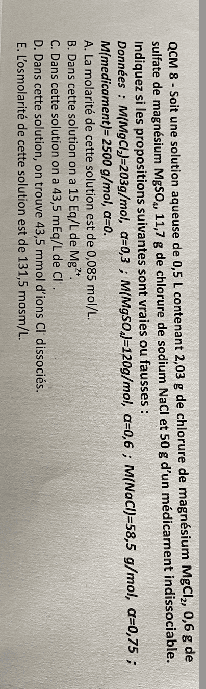 Coralie111 Posted February 21, 2024 Posted February 21, 2024 Bonjour, j’ai essayé de faire ce qcm avec les formules du cours, mais je ne trouve pas les mêmes réponses que la correction. pourriez vous me détailler les calculs qui permettent de trouver les bonnes réponses. je vous mets la correction après. merci d avance. , Je n arrive pas à mettre la correction car le fichier est trop lourd…voici les réponses : A: 0,17 mol/L B:15 mEq/L C:7x10^-2Eq/L Emem 1 Quote